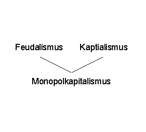 Nach demselben Muster läßt sich aber auch für den Monopolkapitalismus oder den Imperialismus plädieren. Als These kann man sich des feudalen Gesellschaftszustandes bedienen, als dessen Negation oder Antithese den Kapitalismus mit der bürgerlichen Freiheit und der Freiheit des Unternehmens und des Handels anführen; der Imperialismus mit Monopolkapitalismus läßt sich dann recht gut als Synthese aus Feudalismus und Kapitalismus beschreiben.