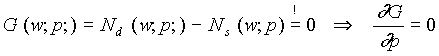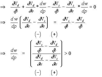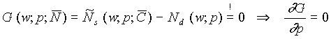 Die repräsentative Unternehmung und der repräsentative Haushalt lassen sich zu einem Modell mit drei Märkten zusammenfassen, das bei fehlenden Restriktionen neoklassiche Eigenschaften hat.[20] Am Gütermarkt herrscht Gleichgewicht, wenn der geplante Konsum gleich der geplanten Produktion ist, also Y(w,p)=C(w,p) gilt.[21] Ausgehend von einem Gleichgewicht müssen sich zu einem höheren Preisniveau auch höhere Löhne einstellen, um den Markt zu räumen.[22] Die Gerade zur Darstellung des Gütermarktgleichgewichts (ein sogenannter Gleichgewichtslokus) verläuft steigend.[23] Ebenso lassen sich am Arbeitsmarkt eine Vielzahl möglicher Gleichgewichte (Bedingung Ns(w,p)=Nd(w,p) )zu einem Gleichgewichtslokus mit steigendem Verlauf zusammenfassen.[24] Der Schnittpunkt beider Gleichgewichtskurven bestimmt das simultane Gleichgewicht am Güter- und Arbeitsmarkt, wobei aus der Stabilitätsbedingung der dynamischen Analyse der steilere Verlauf der Gütermarktkurve folgt (vgl.Abbildung 7:Neoklassisches und neukeynesianisches Gleichgewicht, Anhang).[25] Wenn bindende Schranken vorliegen, müssen aber die Marktteilnehmer unter Annahme der erläuterten dualen Entscheidungshypothese ihre hypothetischen Nachfragen durch effektive ersetzen.