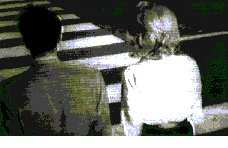Die Zebrastreifen auf der Straße vor dem Baugerüst. Man hört Schritte: ein Unbekannter geht vorbei. /
