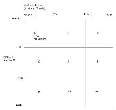 In der Matrix sind Marketingkosten die Summe aus den Personalkosten für den Vertrieb und den Kosten für Werbung und Verkaufsförderung. Der Qualitätsindex wurde weiter oben schon beschrieben.