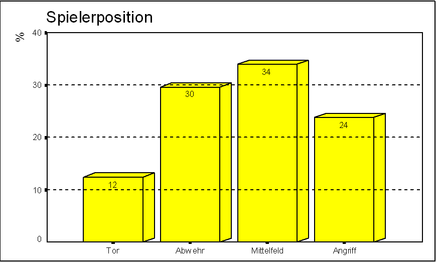 Aus der Häufigkeitstabelle geht hervor, daß die Mittelfeldspieler mit 34 % am stärksten vertreten sind. Es folgen dahinter mit 29,7 % die Abwehrspieler und dann die Angreifer (23,9 %). Die Torwarte bilden erwartungsgemäß das Schlußlicht, was die Grafik nochmals verdeutlicht.