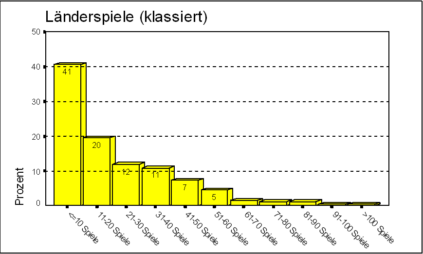 Hier fällt besonders auf , daß 40,6 % der Nationalspieler maximal 10 Länderspiele zum Zeitpunkt der Datenerhebung bestritten haben. Lediglich 2 Spieler der Stichprobe haben bis dato mehr als 100 Länderspiele bestritten (0,5 %) und dürfen somit zu den "Dauerbrennern" gezählt werden.
