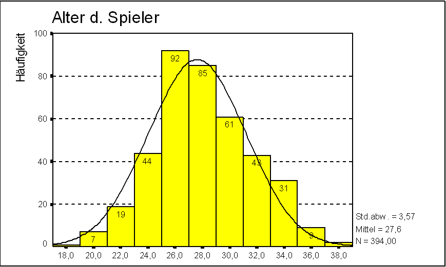Das Alter der Spieler liegt zwischen 18 und 38 Jahren, dies entspricht einer Altersspanne von 20 Jahren. Hierbei tritt das Alter "26 Jahre" am häufigsten auf. Der Mittelwert des Merkmals Alter beträgt 27,617 Jahre, der Median 27 Jahre. Im Mittel weicht das Alter vom Mittelwert um 3,573 Jahre ab.