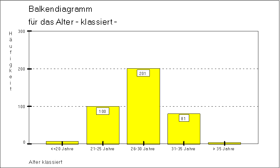 Zur Vereinfachung wurden die Daten klassiert. Aus dem Balkendiagramm kann man erkennen, daß der Anteil der Spieler zwischen 26 und 30 Jahren mit 201 am höchsten ist.