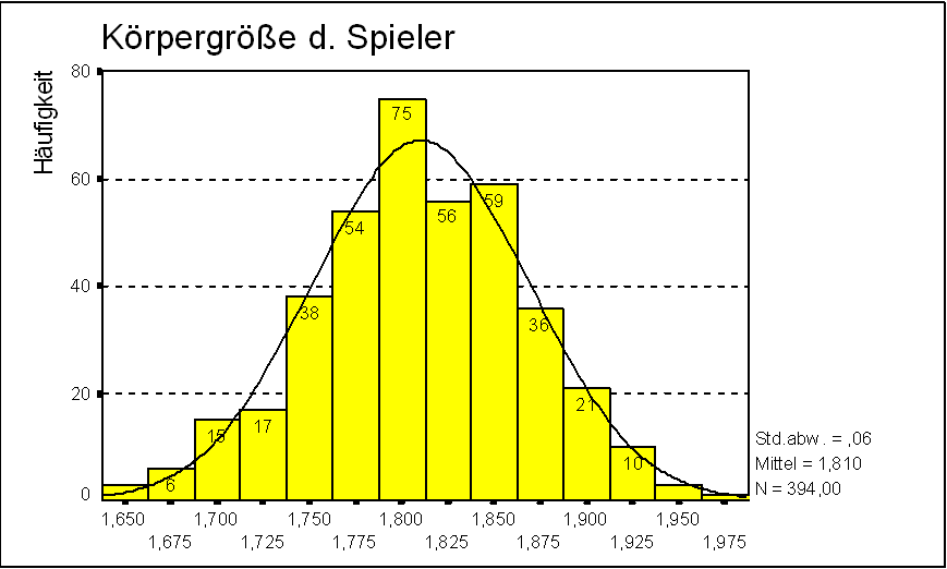 Die Körpergröße ist ein verhältnisskaliertes stetiges Merkmal auf einer Kardinalskala. Die Größe der Nationalspieler liegt zwischen 1,65 m und 1,97 m. Die Größenspanne liegt demnach bei 32 cm. Die Körpergröße "1,78 m" tritt am häufigsten auf. Der Mittelwert beträgt 1,81 m, der Median ebenfalls. Da diese drei Werte fast gleich sind, kann vermutet werden, das diese Verteilung symetrisch ist. Das Schiefemaß beträgt