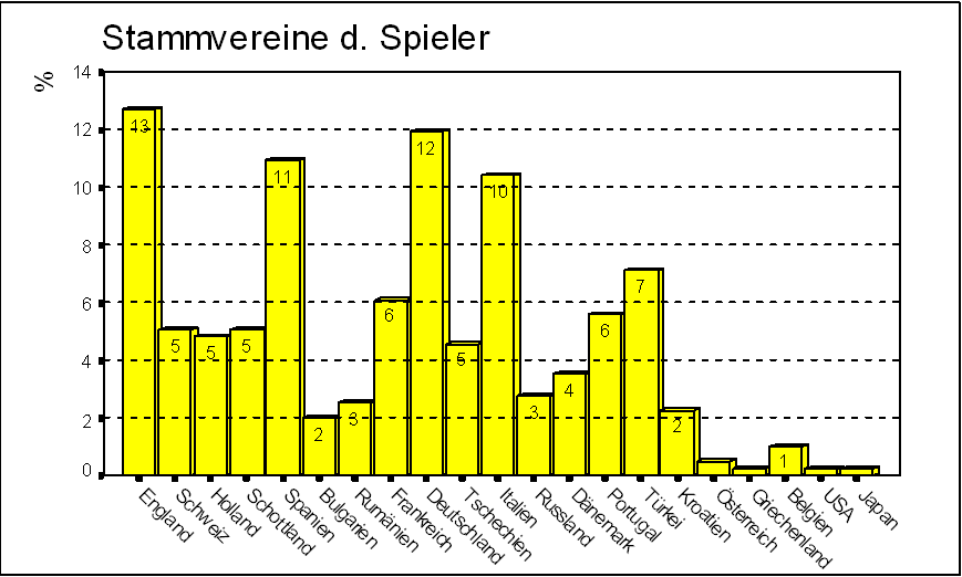 Aus der Häufigkeitstabelle ist zu ersehen, daß mit 12,7 % in England momentan die meisten der 394 an der Europameisterschaft teilnehmenden Nationalspieler unter Vertrag stehen. Dicht dahinter folgt Deutschland mit 11,9 % noch vor Spanien (10,9 %) und Italien (10,4%). Lediglich jeweils ein Spieler ist aus Japan bzw. den USA in sein Nationalteam berufen worden.