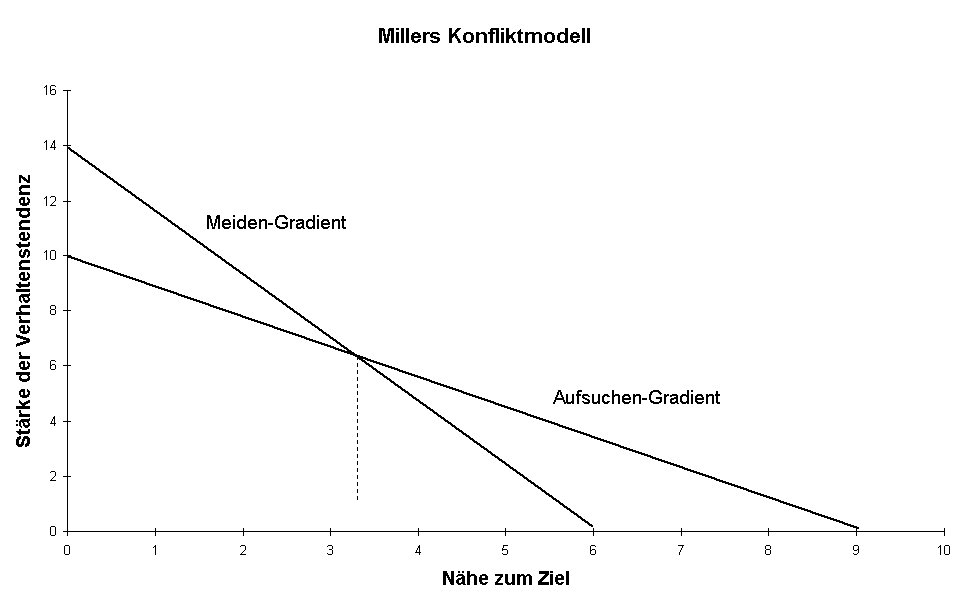 In Abbildung 3 wird versucht (genau wie bei Lewin in Abbildung 2) graphisch darzustellen, wie die ersten vier Annahmen das Verhalten einer Persönlichkeit beschreiben. Die Annahme, der Meiden-Gradient sei steiler, als der Aufsuchen-Gradient, erklärt Miller durch die unterschiedliche Triebbasis der Tendenzen. Untersuchungsergebnisse dieser Art werden oft aus Tierversuchen gewonnen, bei denen Triebe wie Hunger, Durst oder Sex als Untersuchungsgegenstand beobachtet werden. Diese Triebe haben ihren Ursprung im Organismus des Versuchstieres. D.h. der Hunger oder Durst eines Versuchstieres ändert sich nicht, egal wohin es sich bewegt. Hingegen beruht der Meiden-Gradient oft auf einem erworbenen Trieb wie Furcht, wenn z.B. das Ziel nur durch von außen zugefügten Schmerz erreicht werden kann. Damit hängt die Stärke des Meiden-Gradienten auch von der Bekräftigung und der engen Verknüpfung an die ursprüngliche, schmerzerzeugende Situation