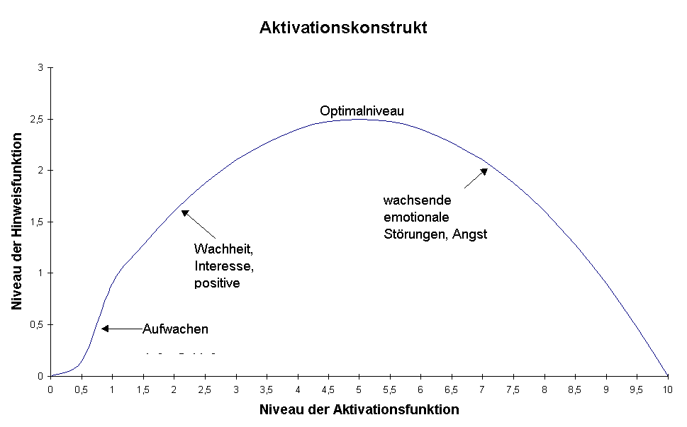 In einem sehr hohen, bzw. sehr niedrigen Aktivationszustand ist die Leistung beeinträchtigt. Als sehr niedrig ist z.B. die Schlafphase anzusehen, als hoher Grad der Aktivation könnte ein Zustand von Wut oder Angst verstanden werden. Die Leistung einer Handlung scheint bei normalem Grad der Aktivation (ruhiger Wachzustand) am günstigsten zu sein. (vgl. Abbildung 5)