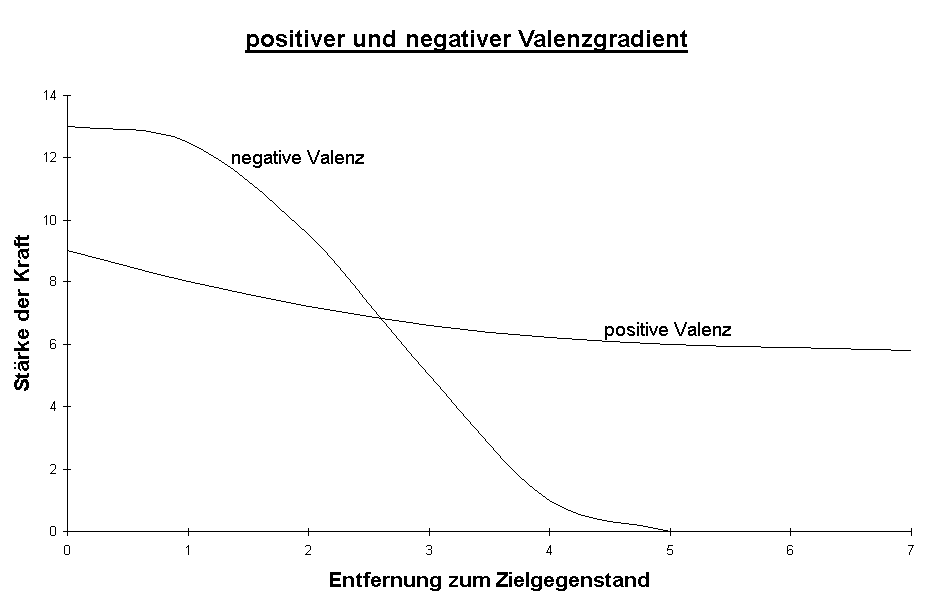 Damit sind für Lewin im Wesentlichen zwei Kräfte verantwortlich für eine Verhaltenstendenz einer Persönlichkeit: zum einen die Stärke der Valenz des Zieles und zum anderen die noch zu überwindende Distanz zum Ziel. "Distanz kann psychologisch auch anders als an geographischer Entfernung ermessen werden; z.B. als Zeitstrecke oder als Anzahl von nötigen Zwischentätigkeiten oder deren Schwierigkeiten oder deren erforderlicher Kraftaufwand u.a."