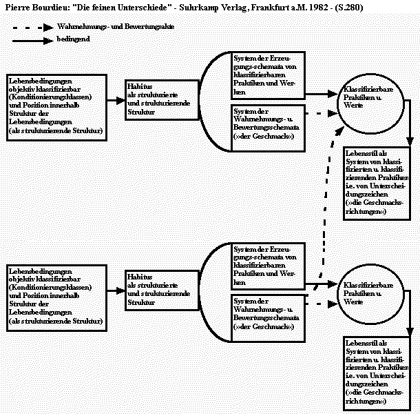 "Der Habitus ist Erzeugungsprinzip objektiv klassifizierbarer Formen von Praxis und Klassifikationssystem dieser Formen." (S. 277) Er erzeugt also Formen des Verhaltens und der Wertung. Diese entstehen nicht willkürlich, sondern durch Einfluß des sozialen Raumes. So wie der jedem Individuum inhärente Habitus durch den sozialen Raum strukturiert wird, strukturiert er selbst anhand jener Strukturierung Systeme der Erzeugung von Verhalten (Praxisformen) und Bewertung (Geschmack). Er ist also strukturierte und strukturierende Struktur in einem (S. 279). Zwei Punkte lassen sich daraus erkennen: