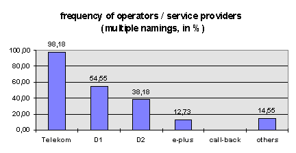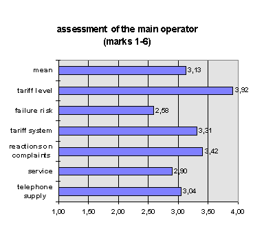 The assessment of the main operator (generally Telekom) shows inter-esting aspects for the coming competition. Bad marks for tariffs and reactions on complaints are weak-spots of Telekom and targets for aggressive marketing of the future competitors. Of course the improve-ment of quality must be combined with attractive prices to entice clients away.