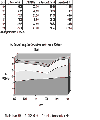 Während der ordentliche Haushalt, obschon der schlechten Zahlungsmoral der Mitglieder der ICAO in der Jahren 90-95 kontinuierlich von 39,393 auf 52,204 Mio. US-Dollar wuchs, sank der Beitrag der UNDP zu dem außerordentlichen Haushalt in der Jahren 1990 bis 1993 von 32,400 auf 18,000 Mio. US-Dollar. Dies führte in den Jahren 90-93 zu einem sinkenden außerordentlichen Haushaltsvolumen, und somit zu einem abnehmenden Gesamthaushalt. Erst durch die beinahe Verdopplung der UNDP-Mittel im Jahre 1994 (33,900 Mio. US-Dollar) erreichte der Gesamthaushalt der ICAO wieder das Niveau des Jahres 1990 und stieg im Jahre 1995 auf 112,326 Mio. US-Dollar an.