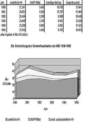 Wie man in Tabelle 3 erkennen kann, gingen die Mittel der UNDP zur Finanzierung der Ausgaben der IMO von 5,4 Mio. US-Dollar im Jahr 1990 auf 0,4 Mio. US-Dollar zurück. Zudem fielen die freiwilligen Beitragsleistungen der Mitglieder von 15,797 Mio. US-Dollar im Jahr 1991 auf 5,955 Mio. US-Dollar 1994. Dies führte zu einem sinkenden Volumen des Gesamthaushaltes der IMO, nachdem er bis zum Jahr 1991 angestiegen war. Zum Jahre 1995 ist wieder ein leichter Anstieg des Gesamtvolumens zu verzeichnen. Zu den Leistungen der IMO gehört die World Maritime University, die 1983 in Malmö, Schweden zur Vermittlung von erweitertem Wissen in der Verwaltung der Seefahrt, Umweltschutz, Hafen- und Schiffsmanagement und in Sicherheitsfragen der Seefahrt gegründet wurde.