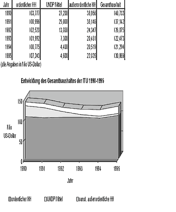 Wie man in Tabelle 4 erkennen kann, wird der überwiegende Teil des Gesamthaushaltes der ITU durch den ordentlichen Haushalt getragen. Im Jahr 1995 beträgt der Anteil des ordentlichen Haushalts am Gesamthaushalt 82,4 Prozent. Der Beitrag der UNDP zum Haushalt sank von 25 Mio. US-Dollar im Jahr 1990 auf 4,6 Mio. US-Dollar im Jahr 1995. Darüber hinaus gingen die außerordentlichen Haushalts-mittel in diesem Zeitraum von 36,956 Mio. US-Dollar auf 22,826 Mio. US-Dollar zurück. Dies führte zu einer Verringerung des Gesamthaushalts von 140,733 Mio. US-Dollar 1990 auf 121,294 Mio. US-Dollar im Jahr 1994. Erst im Jahr 1995 wuchs der Gesamthaushalt wieder auf 130,069 Mio. US-Dollar an, da der ordentliche Haushalt von 1994 zu 1995 um 6,468 Mio. US-Dollar auf 107,243 Mio. US-Dollar angestiegen war.