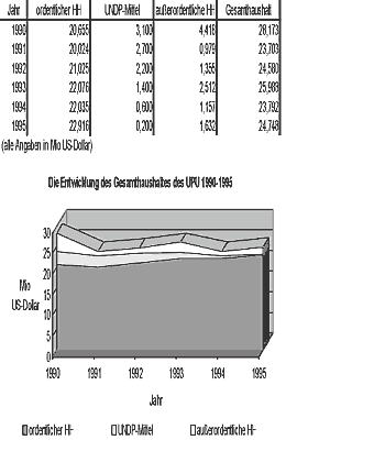 Zur Entwicklung des Gesamthaushalts läßt sich sagen, das der Anteil der UNDP Mittel zur Finanzierung von Projekten des UPU in den neunziger Jahren stark zurück gegangen ist. Er sank von 3,1 Mio. US-Dollar im Jahr 1990 auf 0,2 Mio. US-Dollar im Jahr 1995.