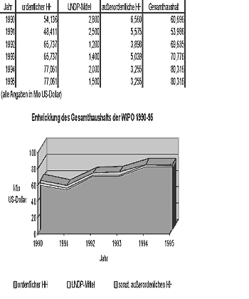 Der Gesamthaushalt der WIPO stieg im Zeitraum von 1990 bis 1995 von 60,696 Mio. US-Dollar auf 80,316 Mio. US-Dollar. Auffallend ist, das der Anteil der UNDP-Mittel sowie der Anteil der außerordentlichen Haushaltsmittel, die sich zum größten Teil aus freiwilligen Beiträgen der