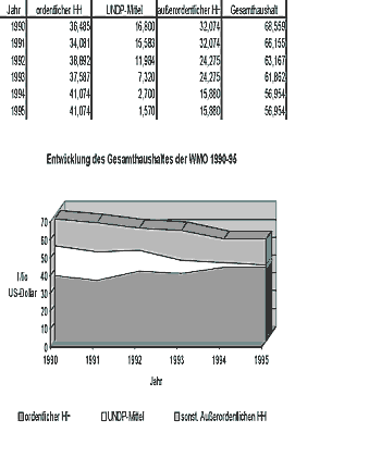 Unter Beachtung der vom Kongreß festgesetzten Höchstgrenze der Ausgaben erstellt der Generalsekretär einen Haushaltsentwurf, der dem Exekutivrat zur Stellungnahme vorgelegt wird. Dieser beschließt letztendlich auch den 4 Jahres Haushalt. Das Beitragssystem der WMO ist ein klassisches Mischsystem, wobei die Beiträge der Mitglieder nach einem 50:50 Schlüssel festgelegt werden. 50 Prozent des Beitrags werden anhand eines WMO-Schlüssels und die anderen 50 Prozent nach dem VN-Schlüssel festgesetzt. Der Gesamthaushalt der WMO sank von 68,559 Mio. US-Dollar im Jahr 1990 auf 56,954 Mio. US-Dollar im Jahr 1995. Der Grund dafür wird in der Tabelle recht deutlich. Die Beiträge der UNDP zum Haushalt der WMO sanken drastisch. Von 16,8 Mio. US-Dollar im Jahr 1990 blieben 1995 nur noch 1,57 Mio. US-Dollar übrig. Dies ist ein Rückgang von über 90 Prozent. Das 1995 erreichte Niveau entspricht dem von 1980 - allerdings nur nominal, real ist es erheblich gesunken. Erwähnenswert erscheint zudem, daß der Haushalt der WMO auf Nullwachstum ausgelegt ist, der Kongreß jedoch zum ersten mal in der Geschichte der WMO für die Finanzierungsperiode 92-95 Vorsorgemaßnahmen für Kostensteigerungen aufgrund der Inflation treffen mußte.