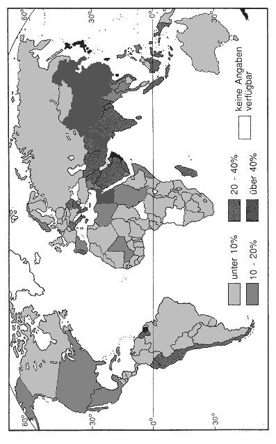 Abbildung 1 zeigt die Schwerpunkte der Bewässerung. Nimmt man den Anteil der bewässerten Fläche am Kulturland als Maßstab, so liegen Ägypten, Pakistan, Surinam, Japan, Korea und China mit über 50% an der Spitze (vgl. Sick 1983, 126). Hierbei fällt auf, daß auch außerhalb der Trockengebiete eine hohe Bewässerungsintensität zu verzeichnen ist (zum Zwecke der Produktionssteigerung), dagegen aber in machen Trockengebieten, wo man typisch Bewässerung vermuten könnte, nur in geringem Maße Bewässerung betrieben wird. Der Grund hiervon ist wohl in der technischen Unterentwicklung zu sehen.