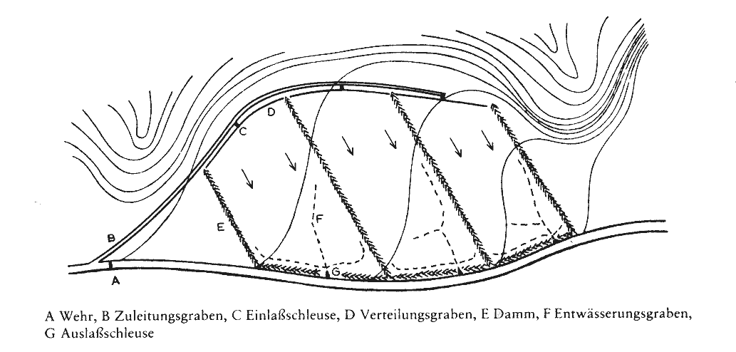 2: Bewässerung durch geregelten Flächenüberstau (Achtnich 1980, 309)
