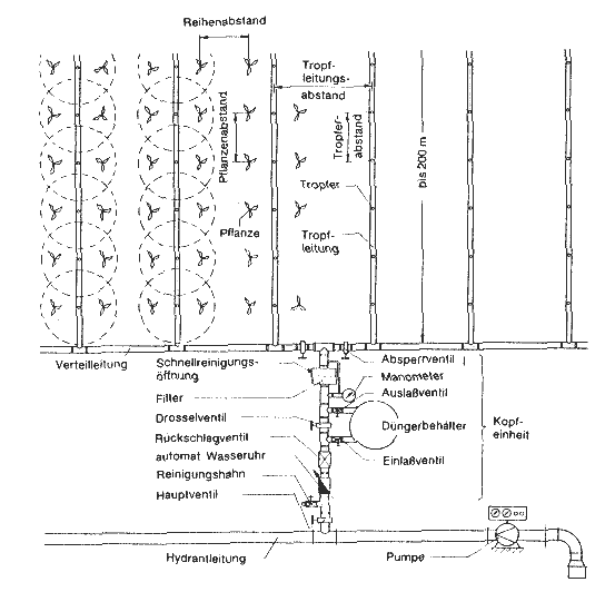Hat man nicht genügend Wasser zur Verfügung, so lassen sich Bewässerungen mit Stau- und Rieselverfahren schwerlich realisieren.