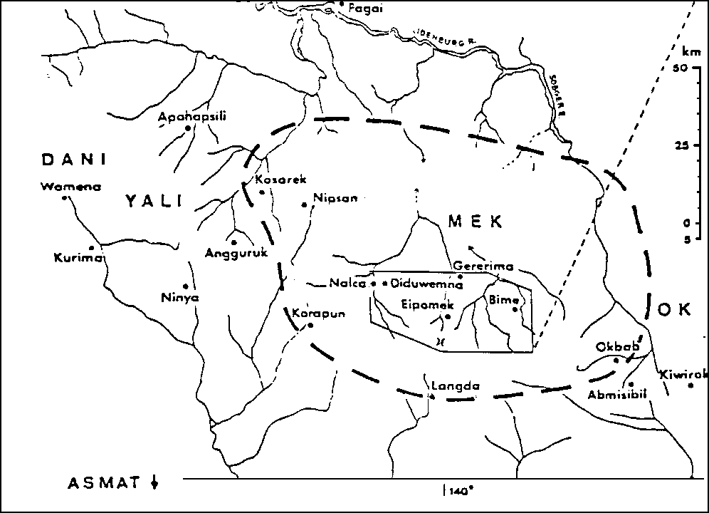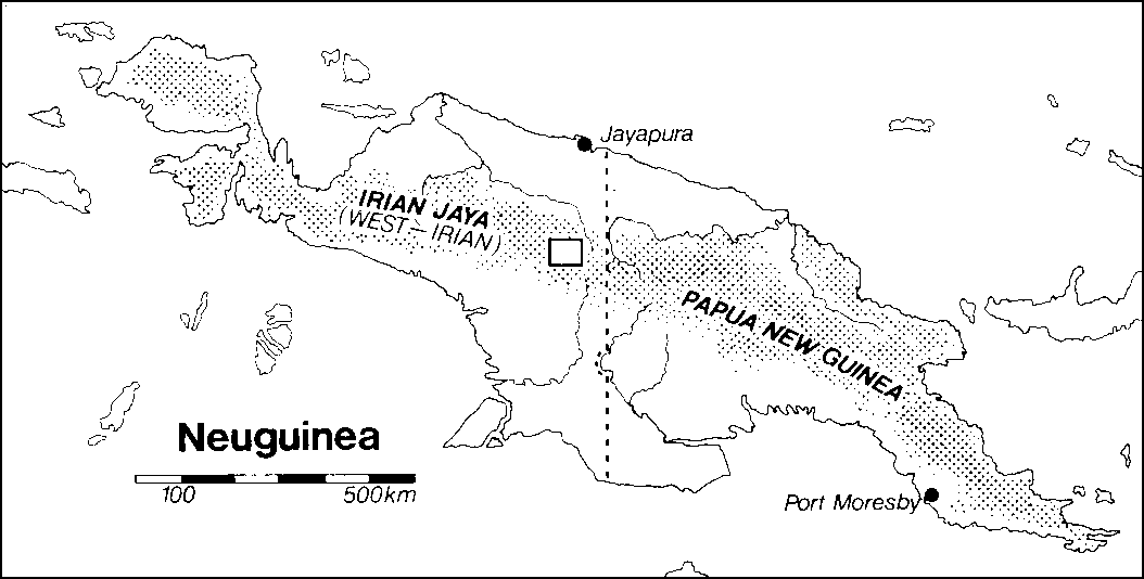 Neuguinea, die zweitgrößte Insel der Welt, ist unterteilt in das im Osten liegende Papua Neuguinea und Irian Jaya, dem zu Indonesien gehörenden Teil der Insel (s. Abb.1, S. 22). Irian Jaya ist von einem Gebirge mit Höhen über 3000 m ü.d.M. durchzogen. Im Hochland herrscht ein feucht-kühles Klima mit fast täglichen Niederschlägen, die Bäche zu reißenden Strömen anschwellen lassen und Wege unpassierbar machen. Die Temperaturen schwanken zwischen etwa 20°C am Tage und bis zu einer Kälte von 5°C in der Nacht. Mit dem Sinken der Sonne sinken auch die Temperaturen jeden Tag rapide schon am Nachmittag, da der Sonnenuntergang bereits gegen 18.00 Uhr stattfindet. Trotzdem wird das Klima von dem im zentralen Bergland Irian Jayas lebenden Einheimischen als gut empfunden (Michel, T., Wirtschaft und Umwelt in der Eipo-Kultur von Moknerkon 13f.). Diese Menschen zählen zu den "Bergpapua". Sie sind mit einer Körpergröße von maximal 150 cm kleinwüchsig, haben dunkles gekräuseltes Haar und eine hell- bis dunkelbraune Haut. Ihre Existenz wurde erst 1945 durch die Luftaufnahmen der USAF bekannt. Auch danach hatten sie praktisch bis in die 70er Jahre keinen Kontakt zur durch die westliche Zivilisation geprägten Außenwelt. Ab diesem Zeitpunkt allerdings wurde das bis dahin großteils isolierte Gebiet langsam sowohl durch Forscher, als auch durch die indonesische Regierung erschlossen. Außerdem wurden Missionen eingerichtet, die einen nicht unbedeutenden Einfluß auf die Menschen und ihre Lebensweise nahmen.
