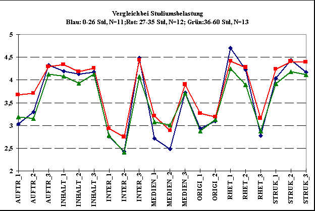 Bei der Aufspaltung der Bewertung nach Studiumsbelastung mußten von uns Gruppen für die Einteilung geschaffen werden. Aus dem Grund der Einhaltung eine gewissen Mindestgruppengröße wurden von uns drei Gruppen gebildet. Die Gruppe 1 umfaßt alle Studenten mit einer Semesterwochenstundenbelastung von höchstens 26 Stunden. Dieser Gruppe gehören elf Studenten an. Die Gruppe 2 beinhaltet alle Studenten, die mehr als 26 und weniger als 36 Semesterwochenstunden absolvieren. Zu dieser Gruppe gehören zwölf Studenten. Die dritte Gruppe schließlich enthält alle Studenten, die einer größeren Belastung als 35 Semesterwochenstunden ausgesetzt sind. Diese Gruppe umfaßt dreizehn Studenten.