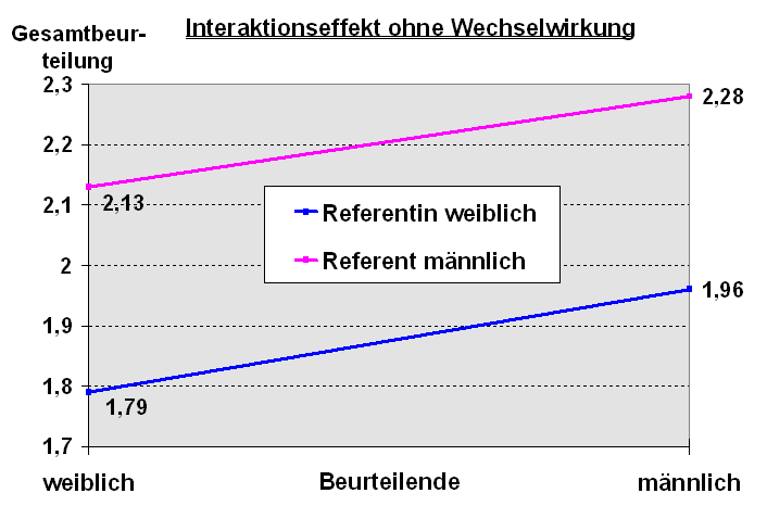 Dies verdeutlicht auch die Grafik 2. Die Geraden, die die Beurteilung der Referenten in Abhängigkeit vom Geschlecht darstellen, würden sich im Falle eines tatsächlichen Interaktionseffekt schneiden. Da dies hier jedoch nicht zutrifft, liegen die Geraden der Referenten/ innen parallel versetzt zueinander, da die weiblichen Referentinnen grundsätzlich besser beurteilt wurden als die männlichen Referenten: